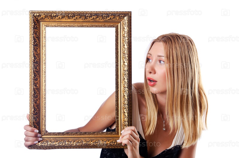 Молодая женщина с фоторамкой на белом фоне