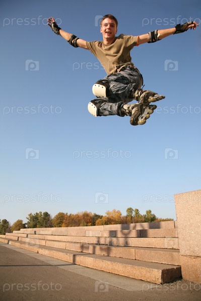 Молодой человек на роликовых коньках в прыжке