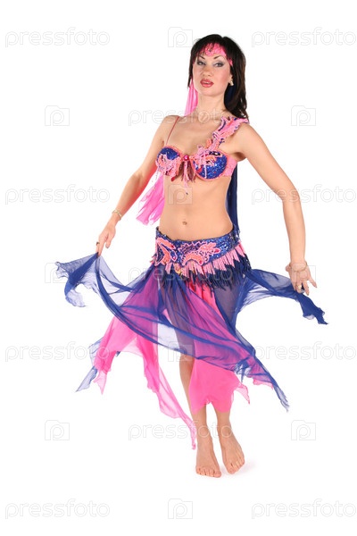 Девушка танцует танец живота на белом фоне
