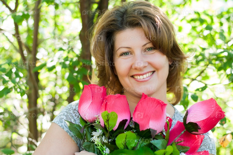Женщина с букетом искусственных цветов в парке летом