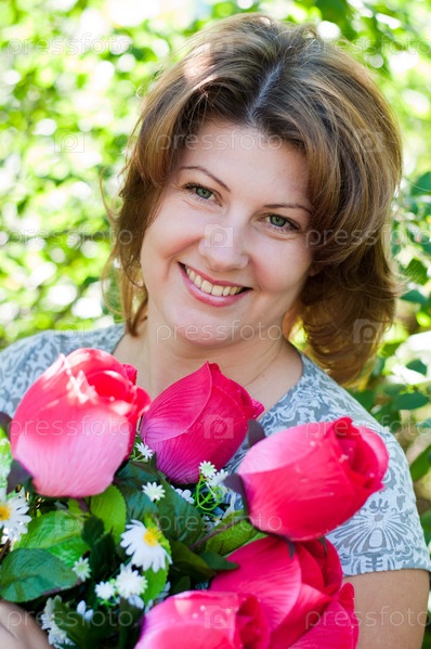 Женщина с букетом искусственных цветов в парке летом