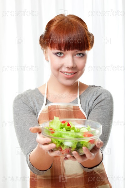 Рыжая домохозяйка держит стеклянную миску с салатом