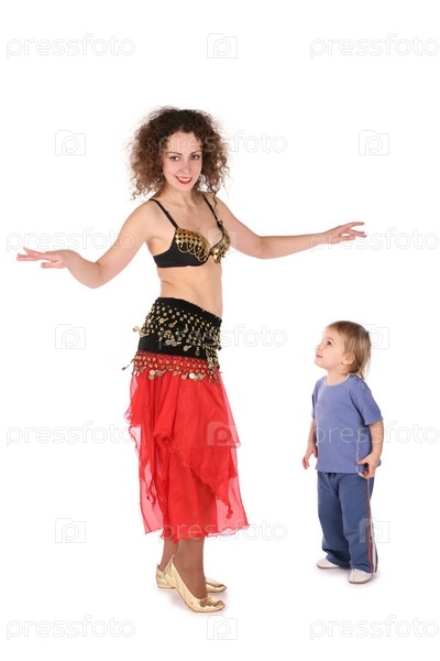Девушка танцует танец живота с маленьким ребенком на белом фоне