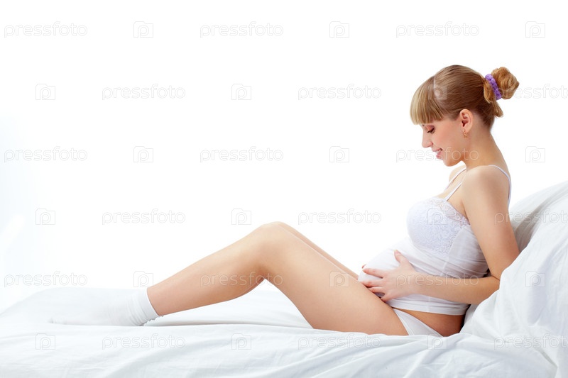 Беременная женщина на белой кровати