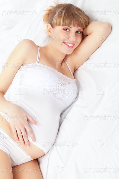 Беременная женщина на белой кровати