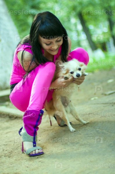 Привлекательная девушка с карманной собачкой