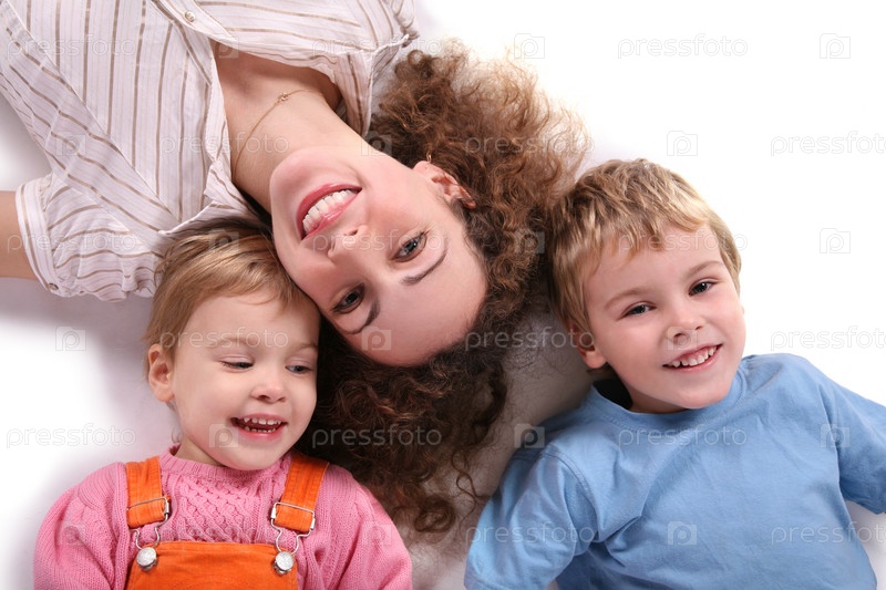 Мама с маленькими детьми на белом фоне