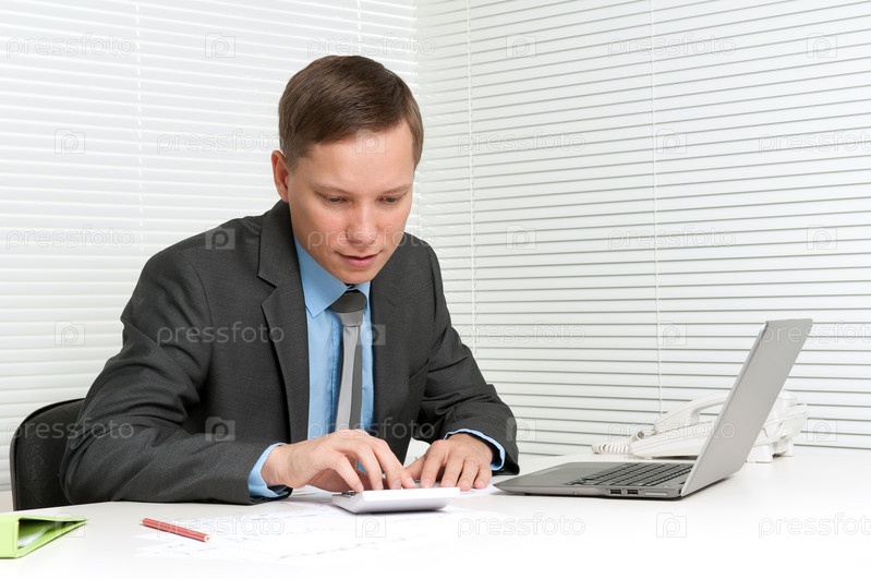 Молодой предприниматель, работающий в офисе, сидит за столом с ноутбуком