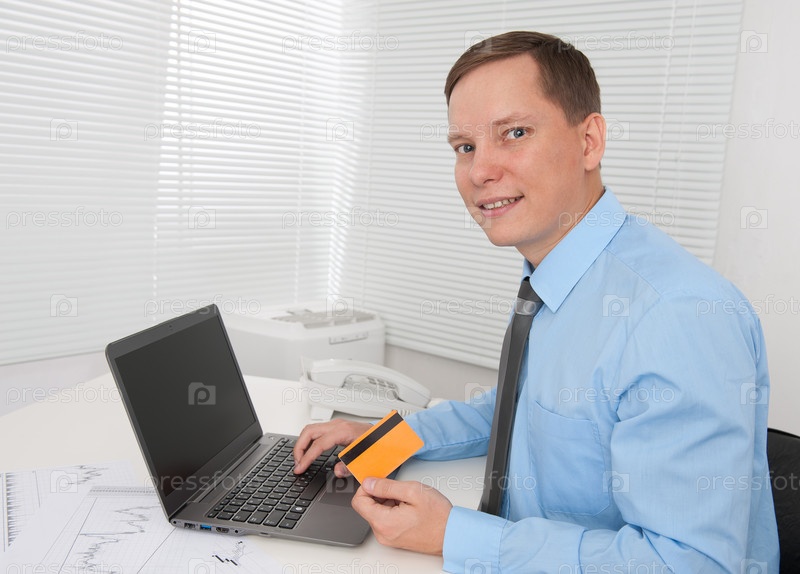 Деловой человек оплачивает он-лайн покупку кредитной картой