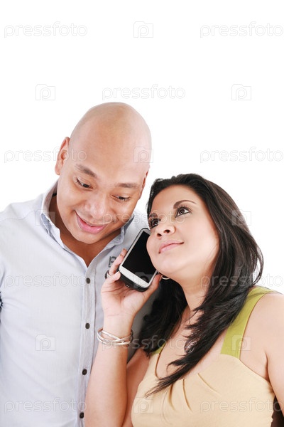 Счастливая молодая пара с мобильным телефоном