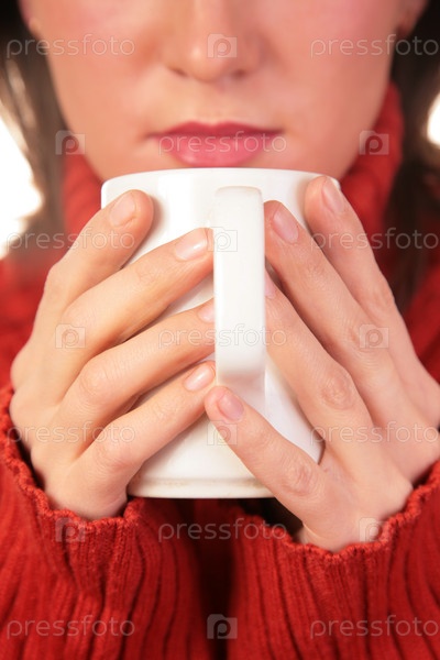 Молодая женщина с белой чашкой в руках