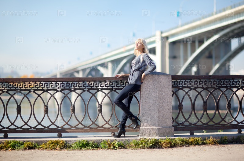 Молодая красивая женщина на мосту