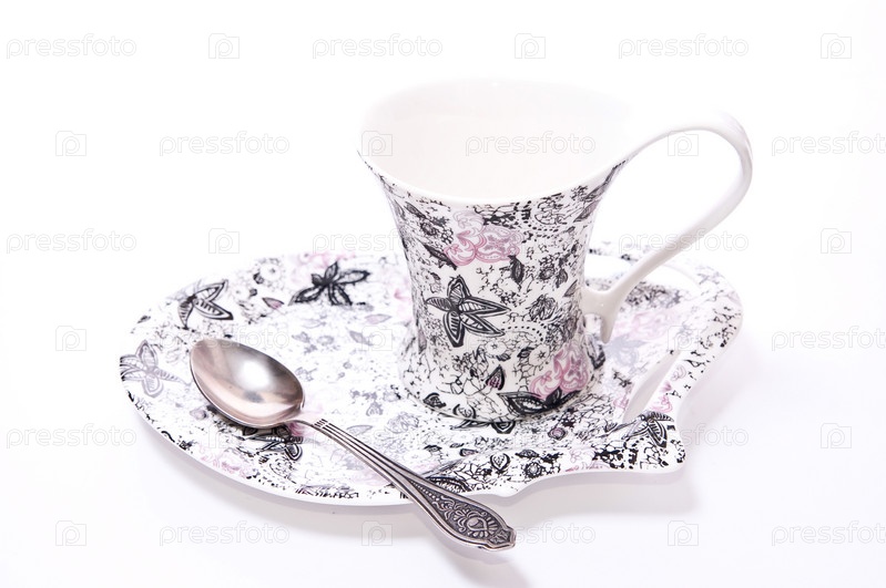 Кофейная кружка с блюдцем и ложкой на белом фоне