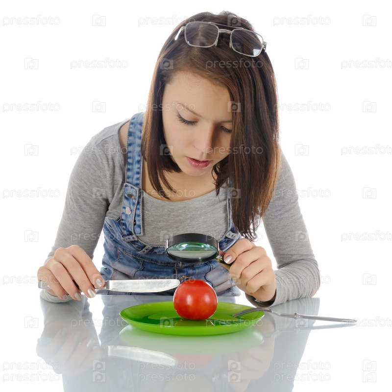 Девушка рассматривает помидор с увеличительным стеклом