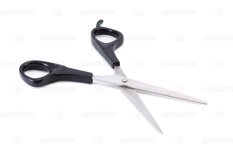 Парикмахерские ножницы с черной пластиковой ручкой на белом фоне