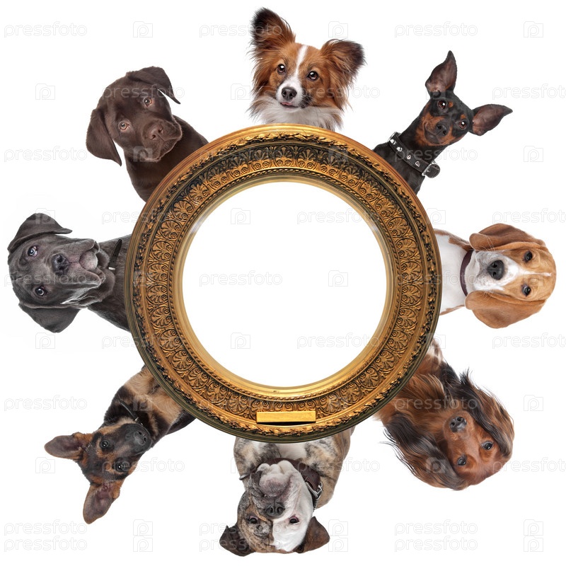 Группа собак вокруг круглой золотистой рамки