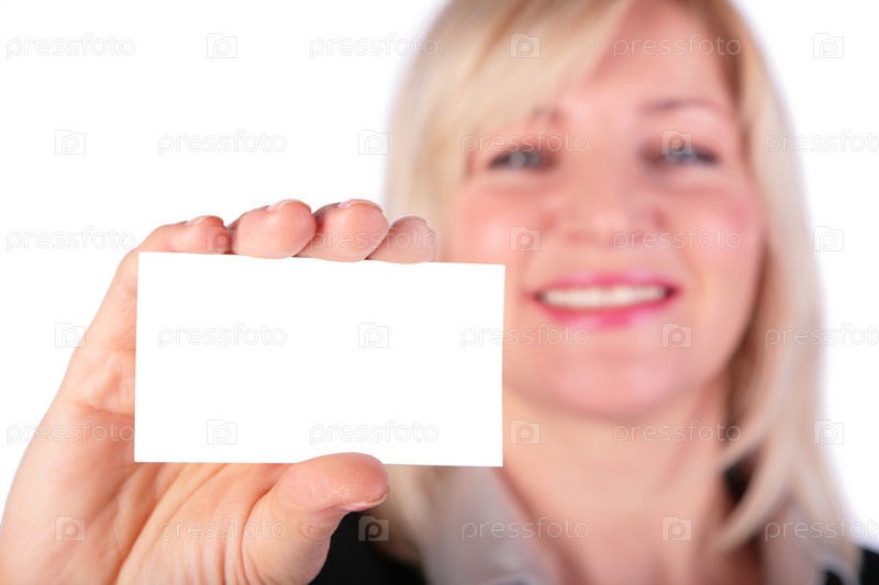 Деловая женщина, показывающая пустую краточку на белом фоне