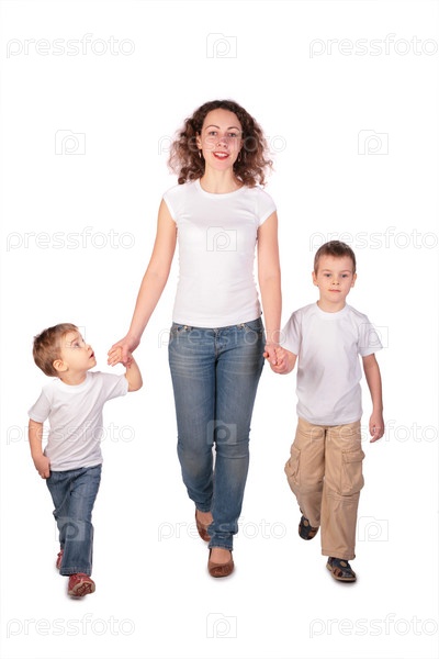 Мама с детьми шагают , на белом фоне