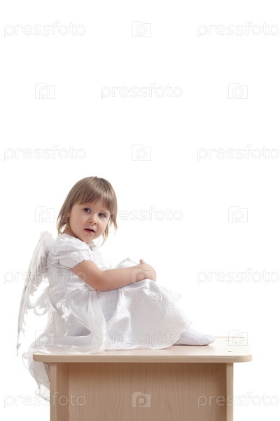 Девочка-ангел сидит на пьедестале