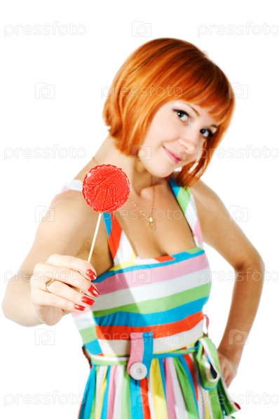 Красивая девушка с красным леденцом на белом фоне