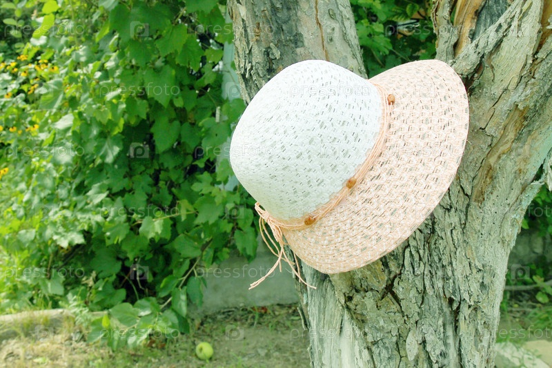Шляпа от солнца и зеленые растения как символ летнего отдыха