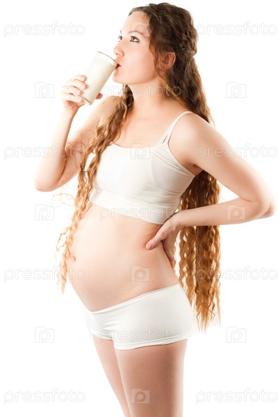 Беременная женщина пьет стакан молока на белом фоне. Понятие диеты и здоровья