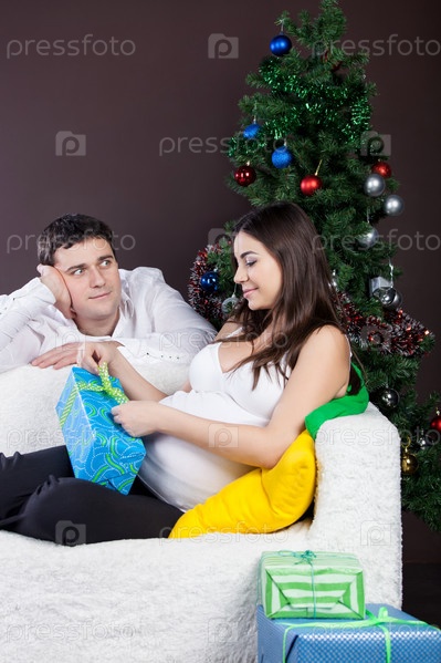 Муж дарит подарок беременной жене на Новый Год