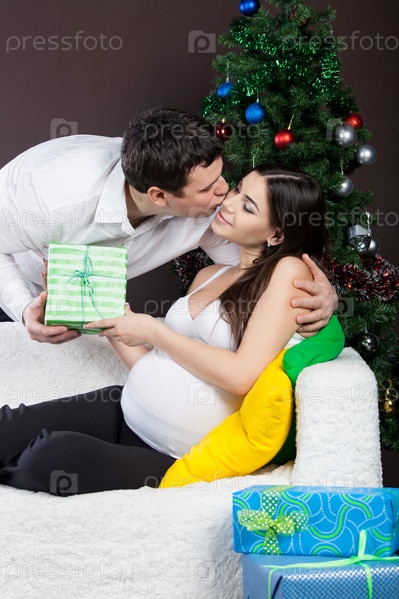 Муж дарит подарок беременной жене на Новый Год