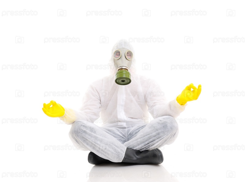 Человек в противогазе и защитном костюме в позе лотоса