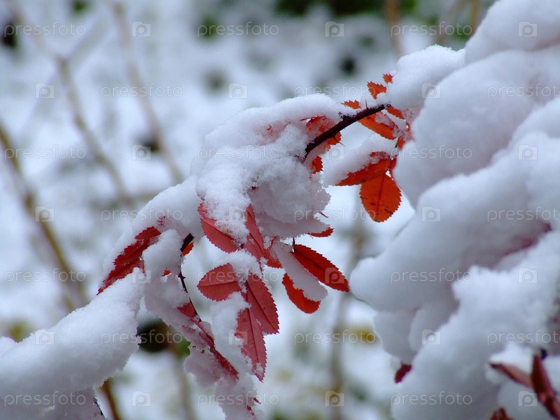 Покрытая снегом ветка куста дикой розы