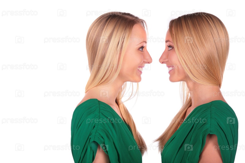 Улыбающиеся девушки близняшки лицом к лицу