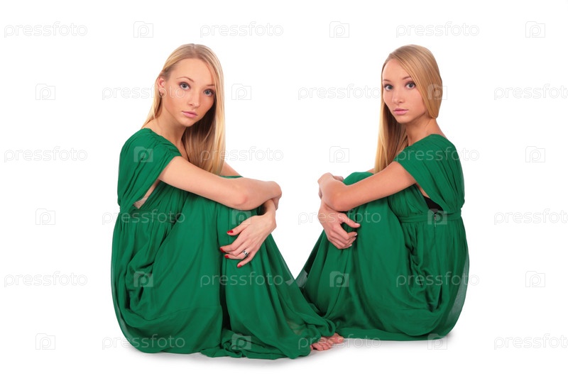 Девушки близняшки, сидящие на полу, на белом фоне