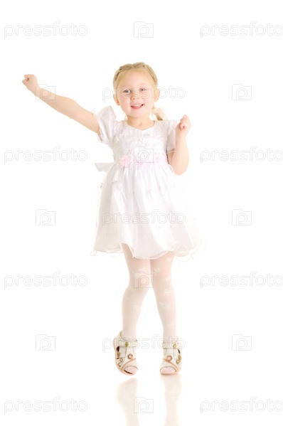 Маленькая радостная девочка в белом платье