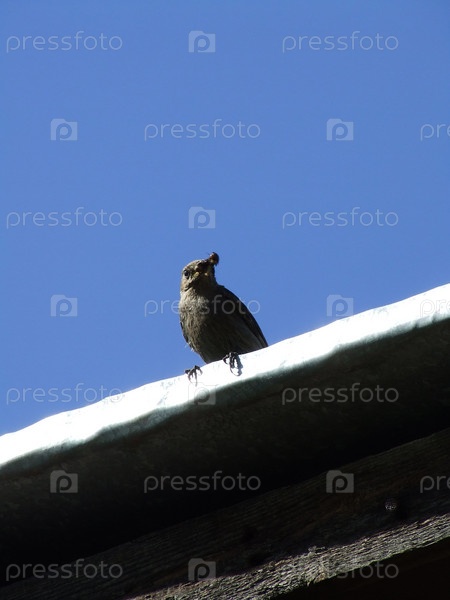 Птица на крыше дома с жуком в клюве