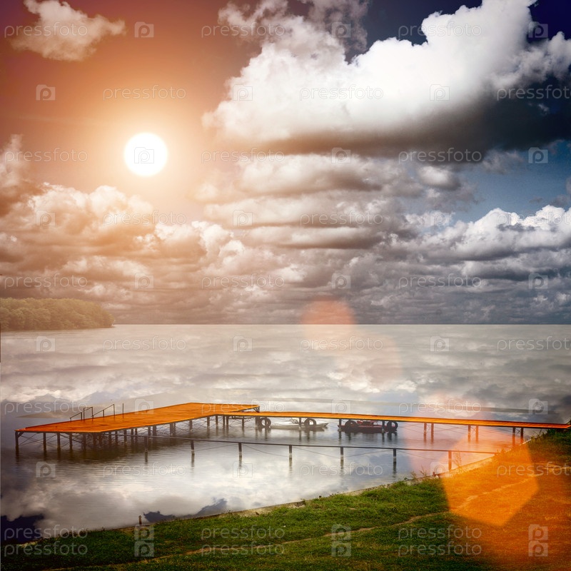 Лодочная станция на красивом озере на закате