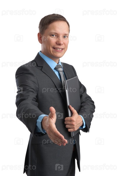 Бизнесмен протягивает руку для рукопожатия, изолированный на белом