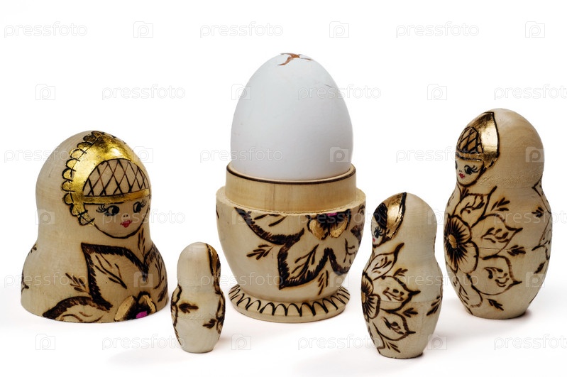 Матрешки и яйцо на белом фоне