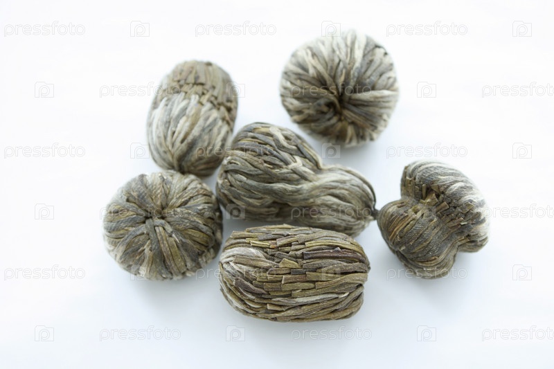 Шарики китайского зеленого чая на белом фоне
