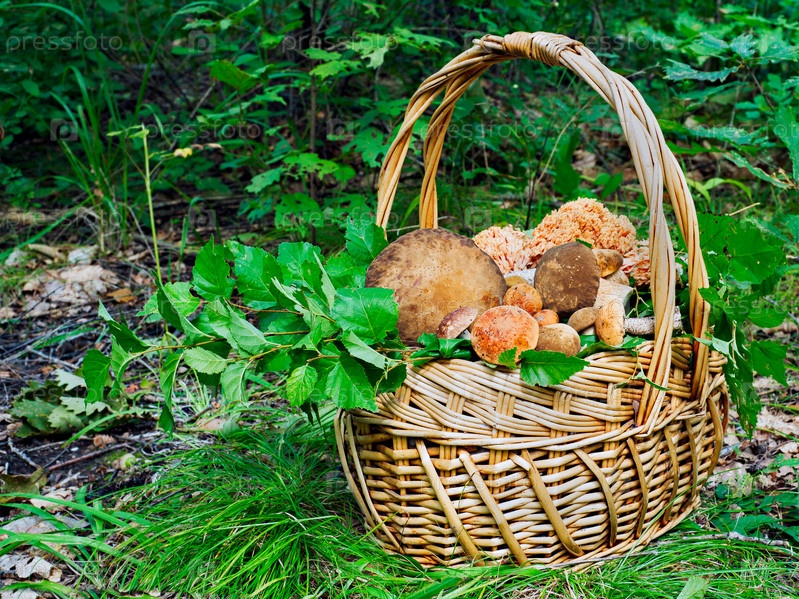 Корзина грибов в осеннем лесу