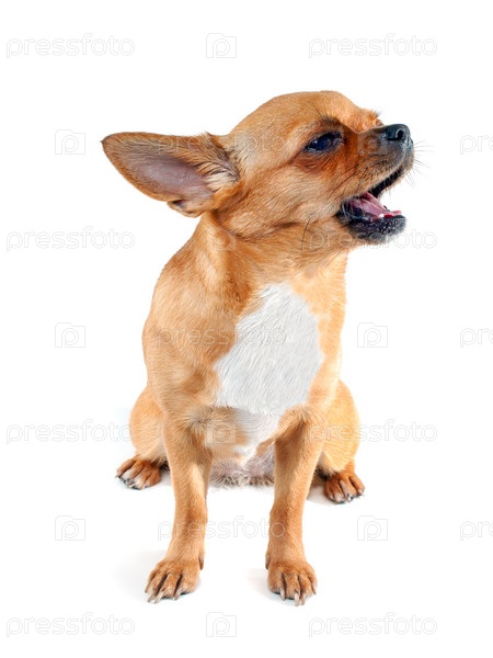 Собака чихуахуа поет веселую песню, изолированная на белом