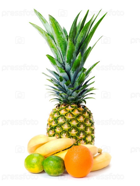 Набор фруктов: ананас, бананы, лимоны и апельсин, изолированные на белом фоне