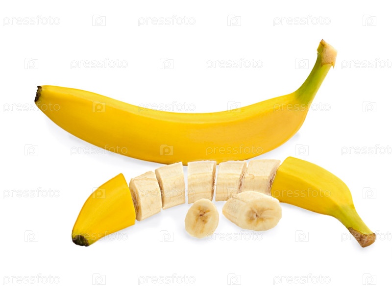 Свежий нарезанный банан, изолированный на белом фоне