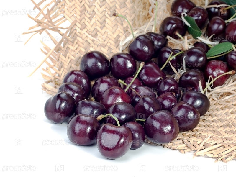 Черешня в соломенной шляпе, изолированная на белом фоне