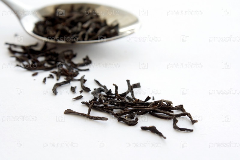 Черный чай с ложечки на белом фоне