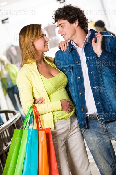 Портрет влюбленной пары, смотрящей друг на друга с улыбкой во время покупок
