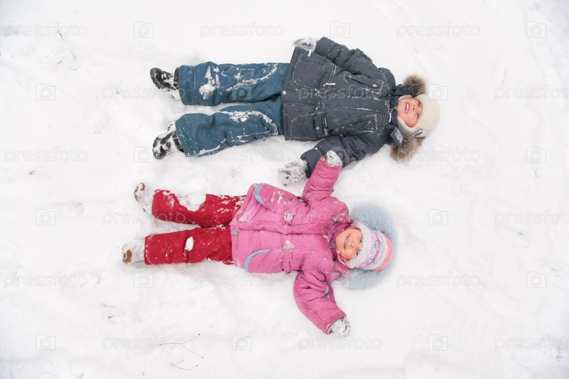 Двое детей лежат на снегу