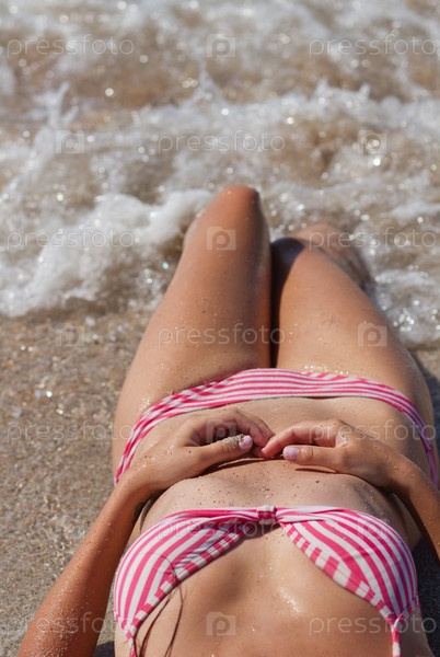 Женщина лежит в приливных волнах на курорте