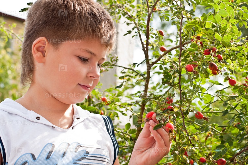 Мальчик собирает спелый шиповник