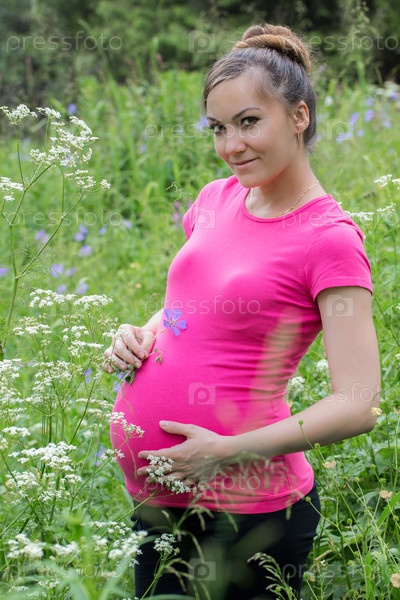 Беременная женщина среди цветов на природе