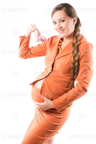 Счастливая беременная женщина с розовыми пинетками на белом фоне